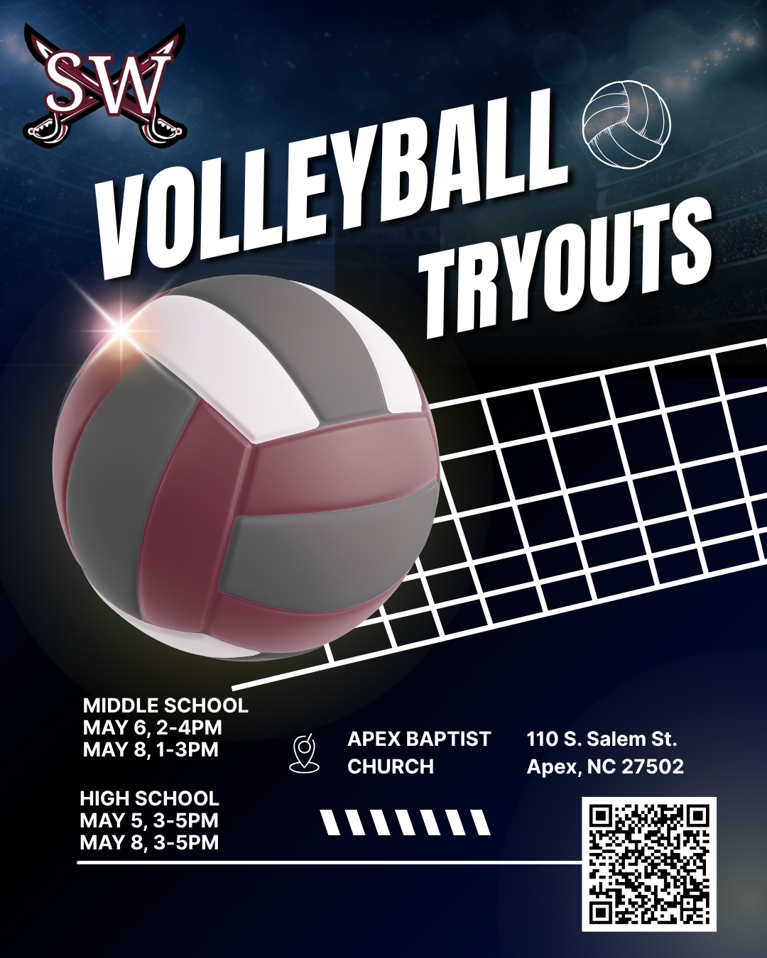 The South Wake Sabres are excited to announce Volleyball tryouts for 2026. We will be holding tryouts on two days for each age group at Apex Baptist Church. Please register using the link provided: https://register.teamsnap.com/form/dvRcw2WxXR36uwn0sKZjk
